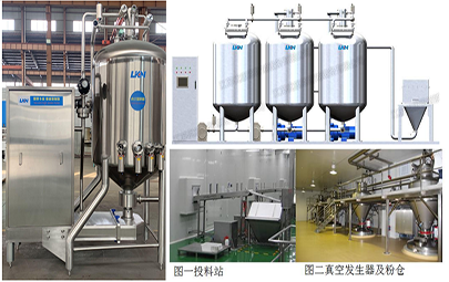 優康恩自動化料系統用于對粉料和其它配料進行乳化和水化的混料系統設備。其中真空混料機可在密閉真空容器下進行高速剪切乳化混合綜合產品、各種粉末和液體等,每小時化粉量可達到3T-5T。優康恩自動化料系統可利用真空作用將配料輸送到化料設備中,省去了操作工承擔這項繁重工作的需要。